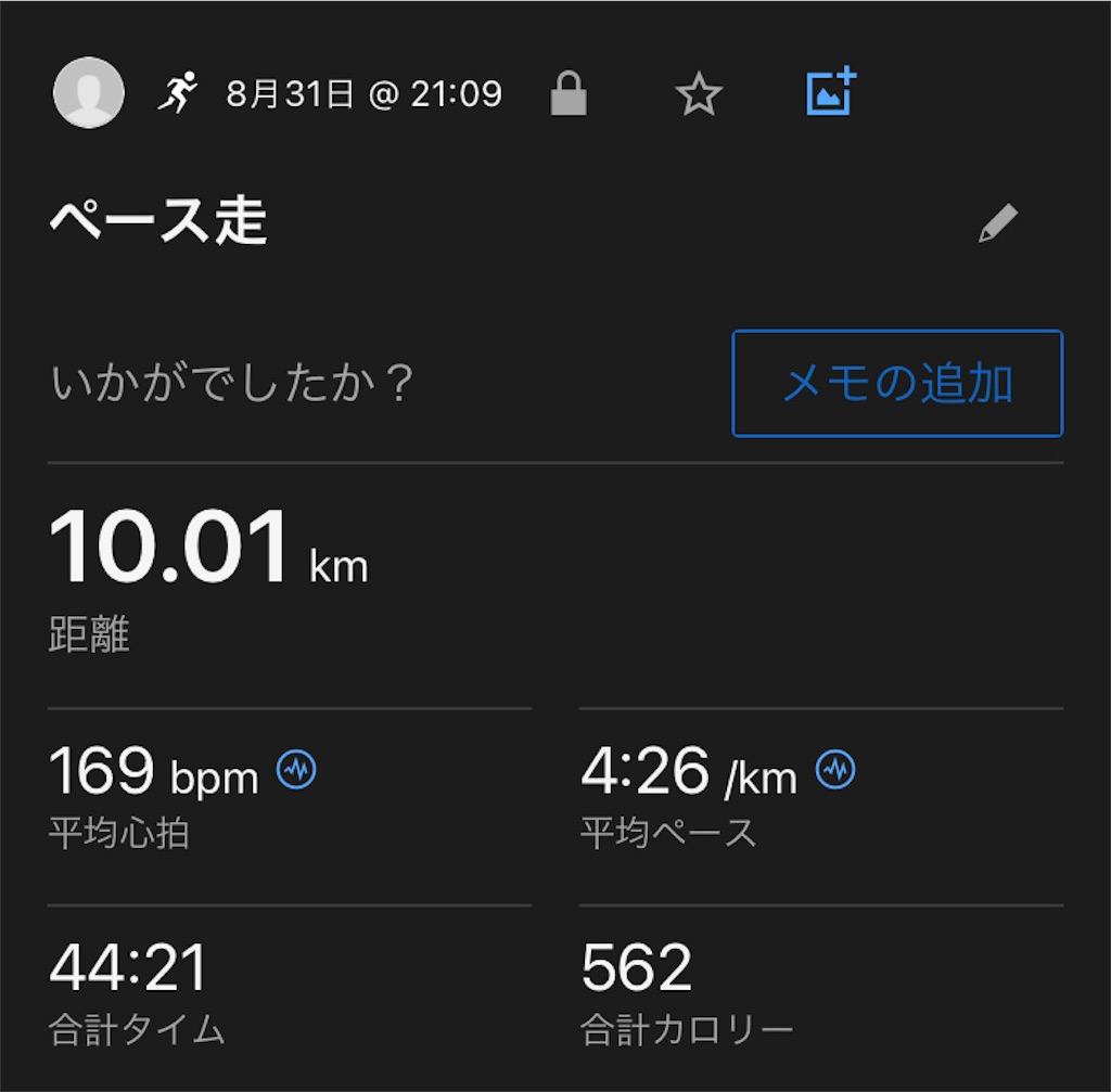 2023-09-03 【日常記録】2023.8.31(木) 日常記録 ランニング記録 先日のラン🏃 記録 トピックス リカバリーもぼちぼちできてきたので、少しペースを上げて4分半のペース走を実施。 筋肉疲労はだいぶ回復してきましたが、足底の痛みがまだ残っているので走りに少し違和感があります。 休み休み回復に努めていきたいと思います。 ↓他のランナーの皆様のブログはこちら☆ マラソン・ジョギングランキング にほんブログ村 ランキング参加中ランニング